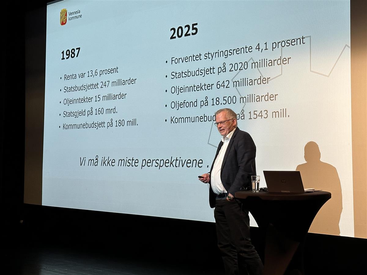 Kommunedirektør Svein Skisland presenterer sitt budsjettforslag for 2025 på et møte i Kulturhuset.- Bare å fjerne merforbruket, blir meget krevende. Det er mange og omfattende kutt, men de er nødvendige. Både innbyggere og ansatte må vise forståelse for at vi må få driften i balanse for å trygge framtida. Vi må kutte mange enkeltposter i budsjettet for å ha penger til det viktigste – trygghet for innbyggerne, sier Skisland.