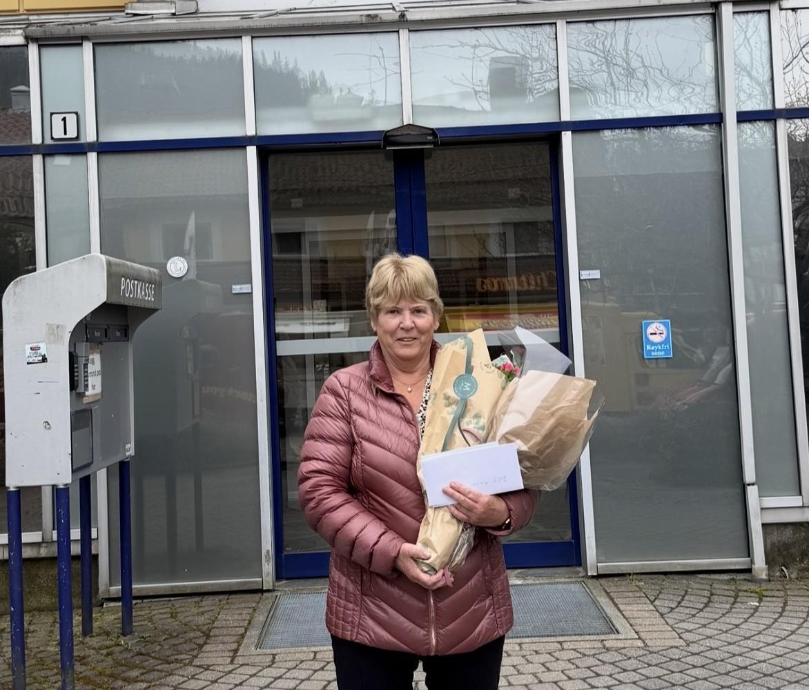 Britt Knudsen forlater Herredshuset etter lunsjtreffet. I tett på 40 år har hun vært renholder i kommunen._Vi er både takknemlig og imponerte. Å være renholder i Venneslahallen og senere Vennesla ungdomsskole i fire tiår, står det stor respekt av, sier avdelingsleder Helge Jensen. Han inviterte på en god lunsj og kake i Herredshuset fredag.