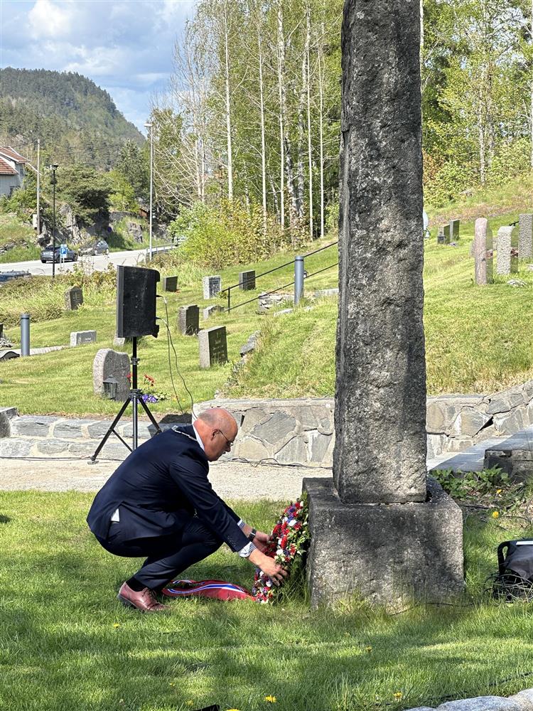 I dyp takknemlighet og respekt til våre veteraner, vil jeg legge ned en krans ved bautaen. Jeg ber om ett minutts stillhet.
