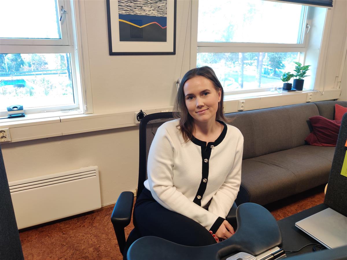 Marthe Hurvenes Hansen foran pulten sin på Herredshuset. Hun stortrives i Vennesla kommune og synes det er svært meningfylt å jobbe for lokalsamfunnet og innbyggerne.– Bare det at de gav meg positiv tilbakemelding og sa «ja, vi vil gjerne treffe deg»... Det føltes som en døråpner, forteller Marthe,som både har studert statsvitenskap og har mastergrad i samfunnskommunikasjon.
