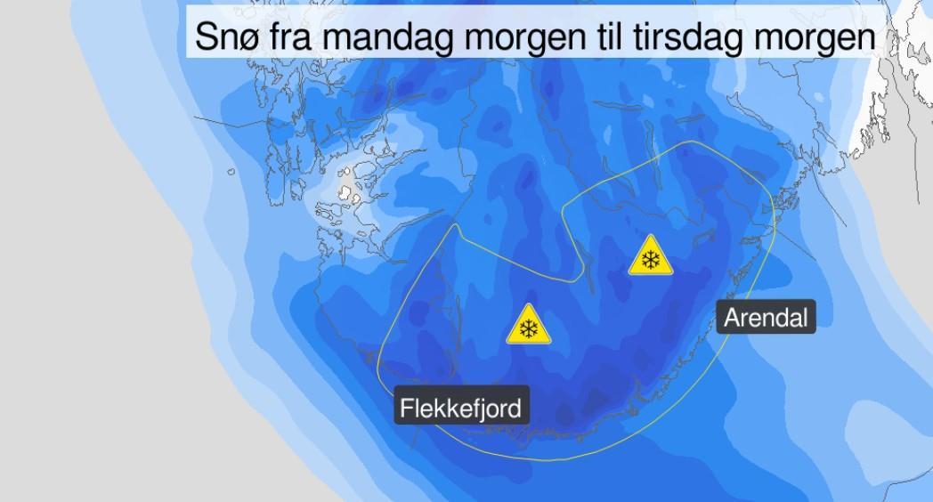 Det er ventet svært mye snø, med lokalt 25 til 40 cm i løpet av 24 timer. Mest snø ventes litt inn fra kysten. Langs kysten blir det overgang til sludd fra sent mandag kveld, først i vest. Utover uka vil det så fortsette med nedbør i form av regn, sludd og snø litt om hverandre.