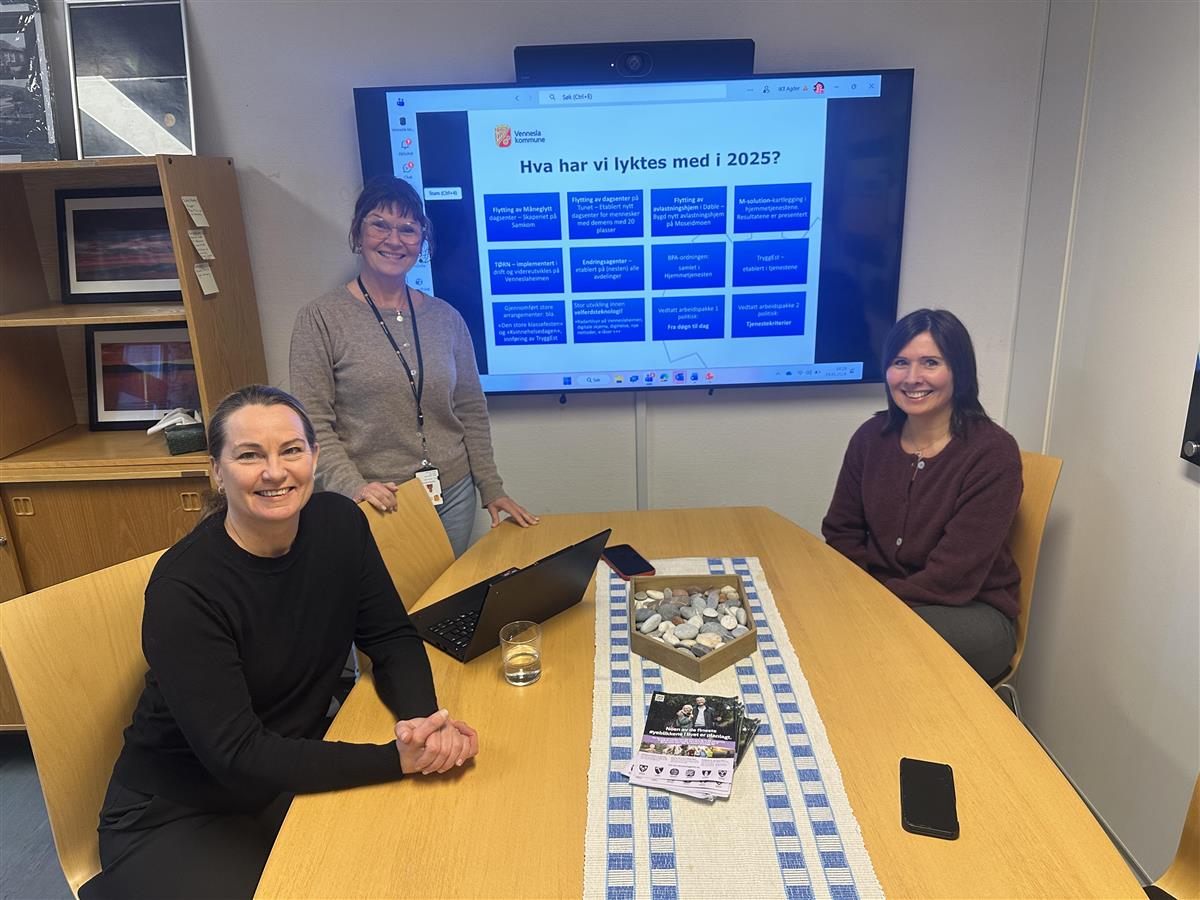 OMSTILLING: Innen helse- og omsorg jobber ansatte og ledere meget godt for å forberede kommunen på de økte oppgavene som kommer. Fra venstre: Rådgiver Line Berhus, kommunalsjef Ragnhild Bendiksen og rådgiver May-Lene Uberg.Om bare 14 år – i 2040 - forventes antall innbyggere med demens å være dobbelt så mange som i dag. Antall mennesker over 80 år vil også bli doblet i Vennesla. Samtidig vil vi bli færre yrkesaktive til å utføre oppgavene som noen må utføre.