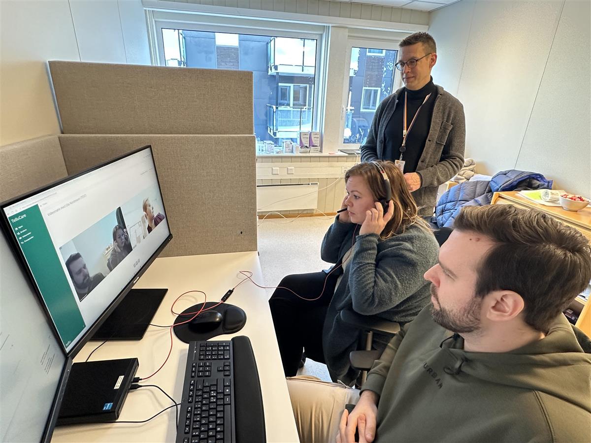 Bildetekst: Sykepleier Even Engesland og hjelpepleier Lene Mjåland tester digitale hjemmebesøk sammen. I andre enden er Linn Camilla Falck Jensen. Enhetsleder Kai-Benjamin Hagemann følger med. Han har store forhåpninger til pilot-prosjektet.