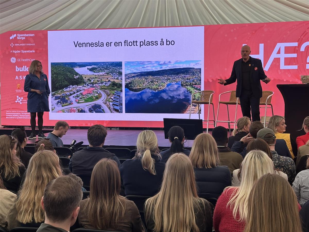 Du ser Nils Olav Larsen framme på scenen sammen med Merete Svendsen i Vennesla Næringsforening. Akkurat da var det så å si stappfullt i det store Agderteltet midt på Youngstorget i Oslo. Tl telter var flere hundre studenter invitert for å høre om hvorfor de virkelig bør vurdere å flytte hjem igjen til Agder etter endte studier.